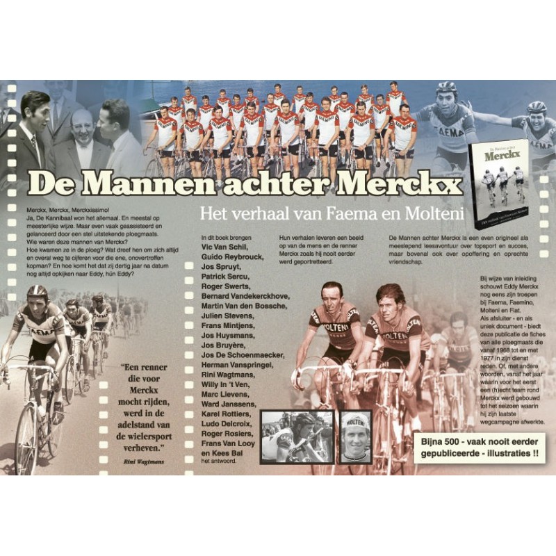 ´De Mannen achter Merckx´ is zowel een leesboek als een kijkboek. Het beslaat meer dan 300 bladzijden. Als inleiding overloopt Merckx zijn carriere en heeft hij het over het wel en wee van zijn ploeg. Daarna komen de 22 topploegmaats aan bod in ruime interviews van meer dan telkens 10 bladzijden. Het derde deel van het boek bestaat uit fiches met foto, palmares en bio van alle ploegmaats die van ´68 tot ´77 (Faema, Molteni, Fiat) bij Merckx gereden hebben. In het boek staan in totaal zo´n 500 foto´s, vooral uit de persoonlijke collecties en albums van de renners. Die foto´s ademen prachtig de tijdsgeest uit en illustreren de kameraadschap binnen de ploeg.