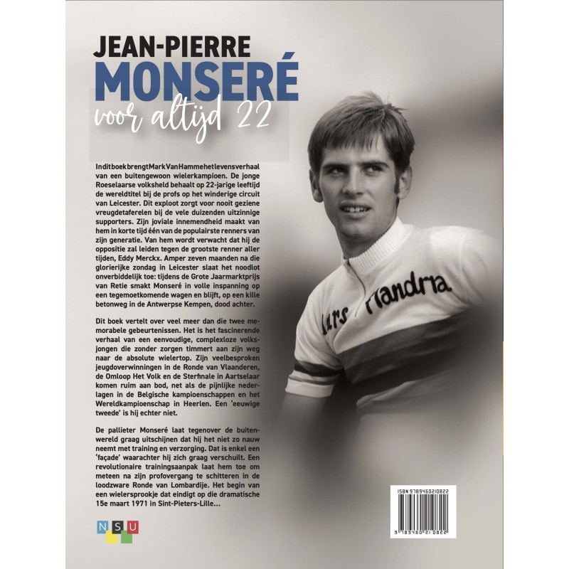 De jonge Roeselaarse volksheld behaalt op 22-jarige leeftijd de wereldtitel bij de profs in Leicester. Dit exploot en zijn joviale innemendheid maken van Monseré in korte tijd een van de populairste renners van zijn generatie. Van hem wordt verwacht dat hij weerwerk zal bieden tegen Eddy Merckx. Amper zeven maanden na die glorierijke zondag slaat het noodlot toe en verongelukt Jean-Pierre tijdens de Grote Jaarmarktprijs van Retie. Dit rijk geïllustreerde boek brengt het fascinerende verhaal van een eenvoudige volksjongen op weg naar de absolute wielertop.