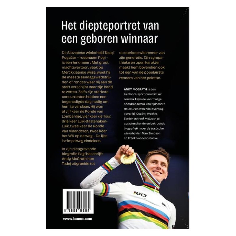 In zijn diepgravende biografie Pogi beschrijft Andy McGrath hoe Tadej uitgroeide tot de sterkste wielrenner van zijn generatie. Zijn sympathieke en open karakter maakt hem bovendien ook tot een van de populairste renners van het peloton.